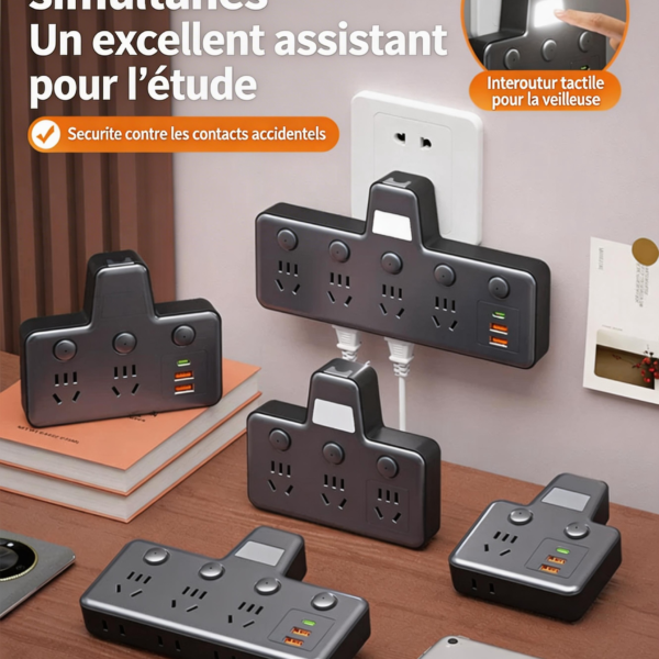 Multiprise verticale multifonction – Prise murale compacte avec plusieurs emplacements, ports USB intégrés, idéale pour bureaux, étudiants et dortoirs ; compatible avec lampes de bureau et autres appareils.