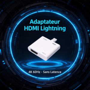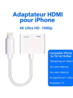Transformez votre expérience visuelle avec cet adaptateur HDMI haute performance, spécialement conçu pour les utilisateurs d’iPhone et d’iPad. Compatible avec les modèles récents — iPhone 16, 15, 14, 13 ainsi que les iPad équipés d’un port Lightning ou USB-C (selon la version) — cet adaptateur vous permet de diffuser facilement du contenu en résolution jusqu’à 4K UHD ou 1080p Full HD sur n’importe quel écran compatible : téléviseur, moniteur ou projecteur.