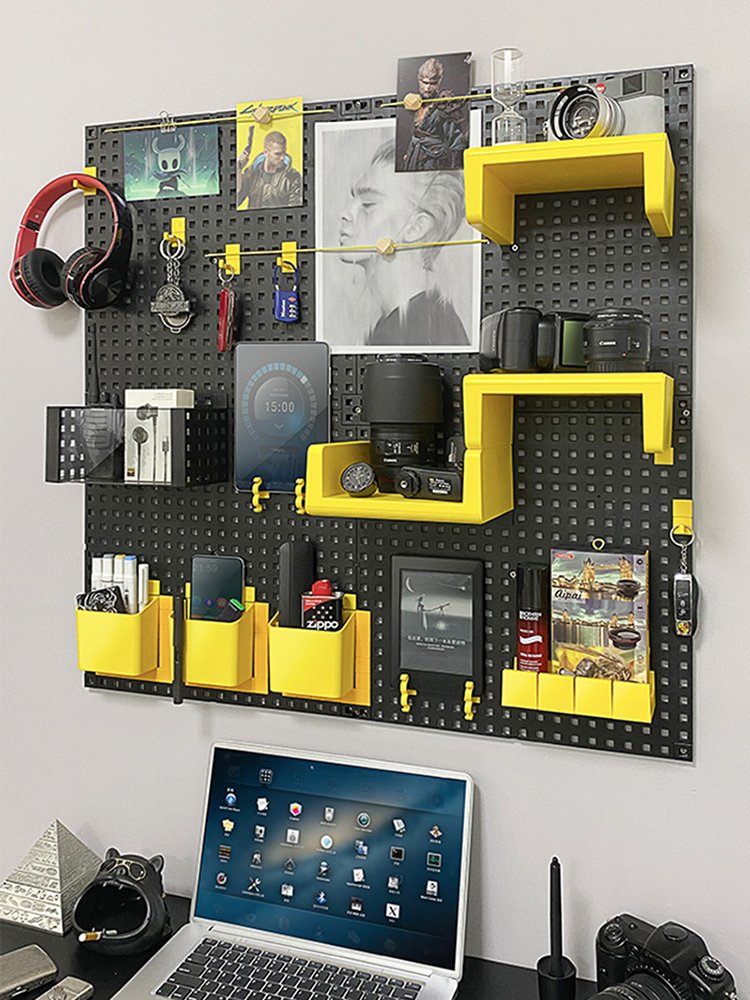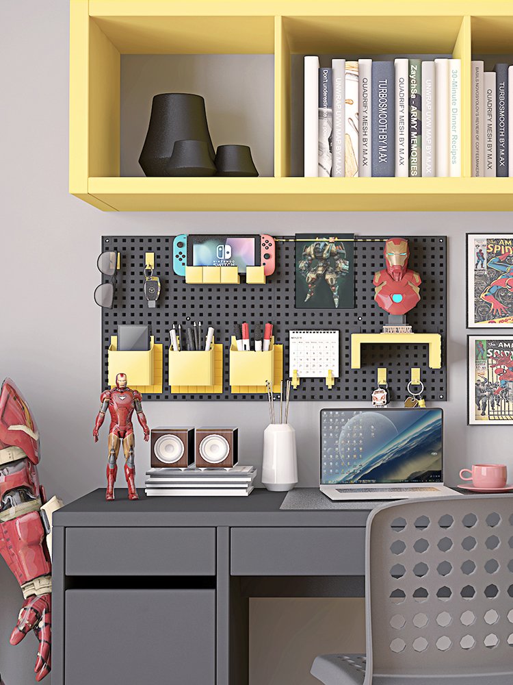 - Panneau perforé modulaire : Le panneau central est conçu avec des trous régulièrement espacés, permettant d’accrocher divers accessoires tels que des crochets , des étagères , ou des supports pour vos affaires quotidiennes.