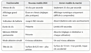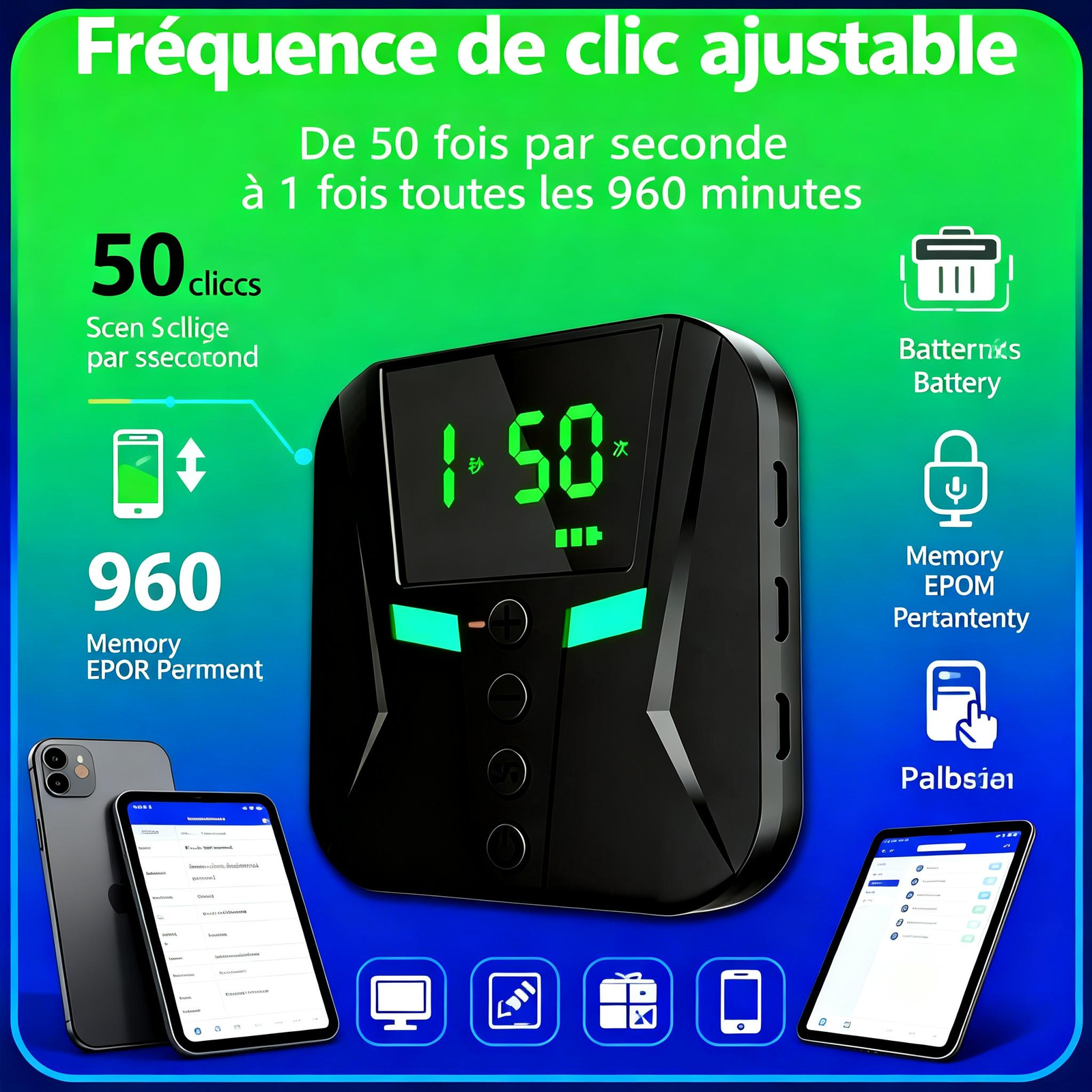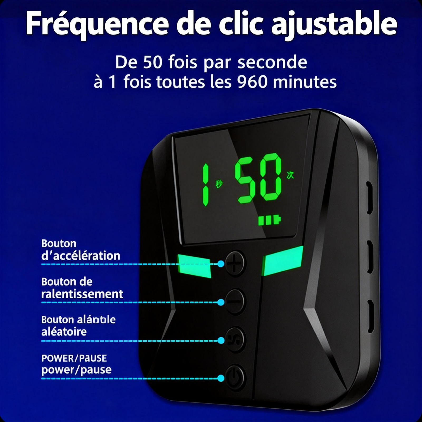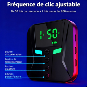 Fréquence de clic ajustable :Définissez le rythme parfait pour chaque situation. De rafales éclair de **50 clics par seconde** à un clic stratégique — le contrôle est entièrement entre vos mains.