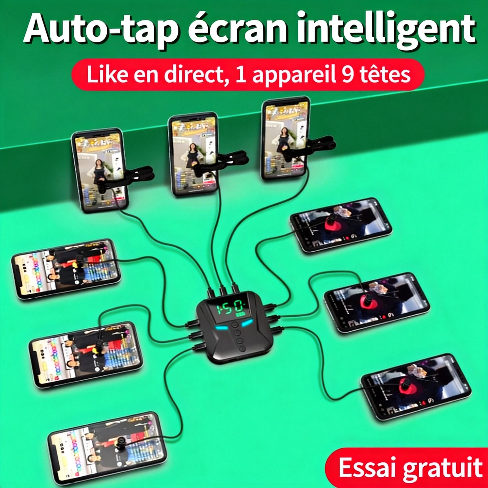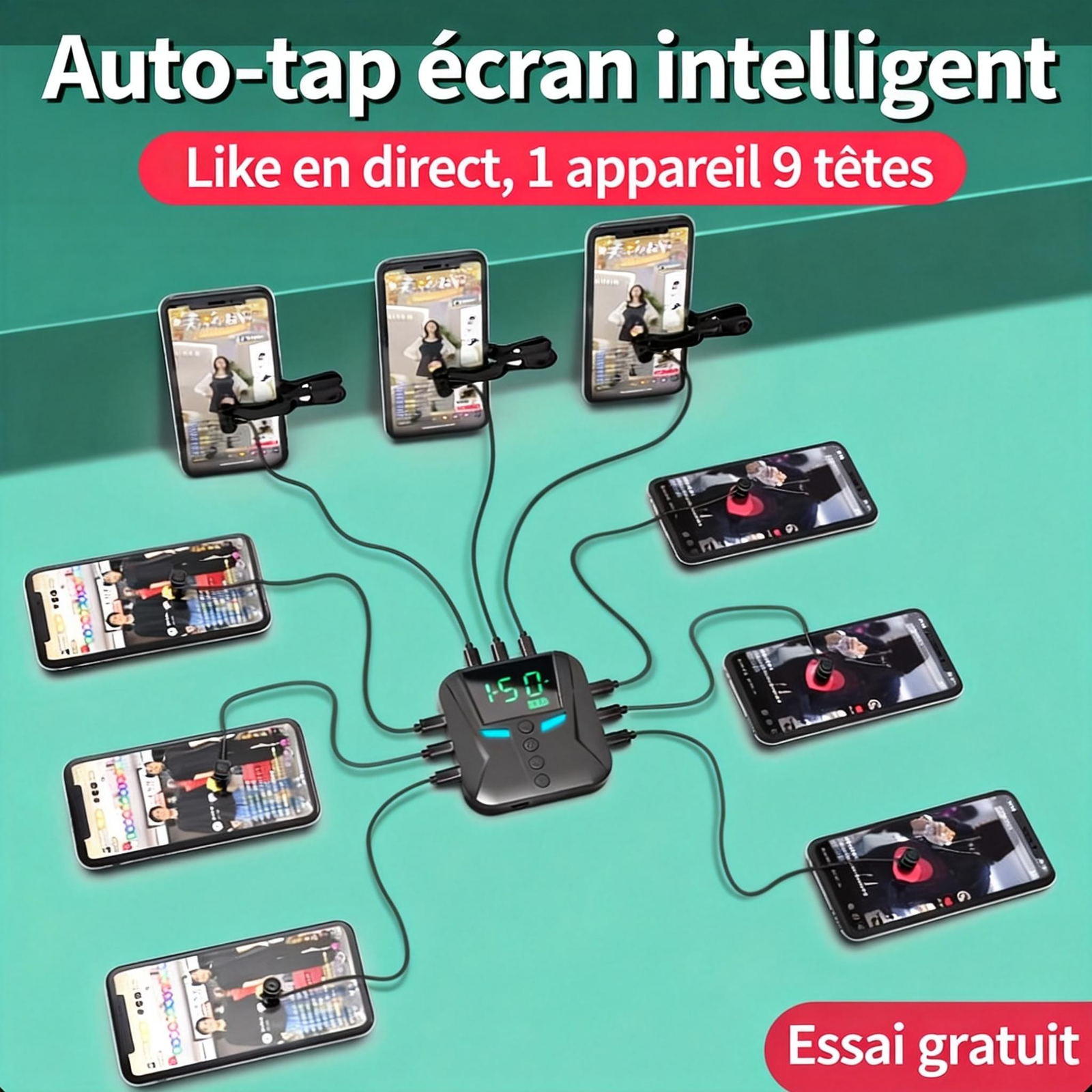 1 appareil, 9 téléphones :Contrôlez jusqu’à neuf smartphones simultanément. Idéal pour amplifier votre engagement en direct ou coordonner plusieurs comptes lors des ventes flash les plus compétitives.